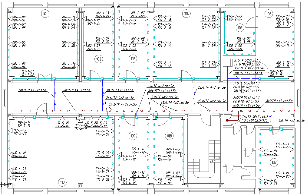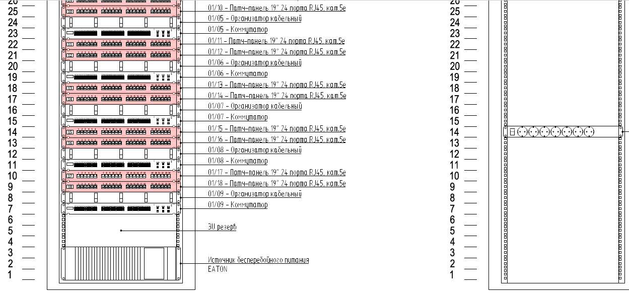 - Чёткая графическая визуализация. Все кабельные трассы, патч-панели, розетки и коммутаторы должны быть отображены ясно и однозначно, без перегруженности схемы.