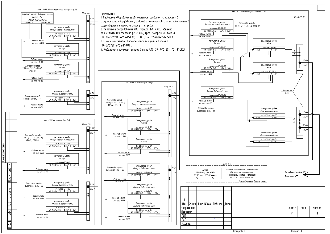 - Разделение по уровням и сегментам сети. Схемы должны показывать магистральные линии, горизонтальные подсистемы, серверные и рабочие сегменты отдельно для лучшей структурности.