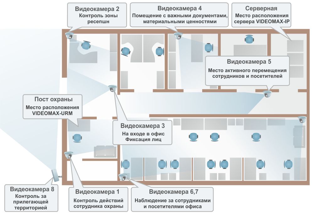 В помещениях с ограниченным доступом (серверные, архивы) целесообразно использовать устройства с высоким разрешением и фиксированным объективом, направленным непосредственно на вход. В таких случаях достаточно одной точки наблюдения на помещение до 30 м².