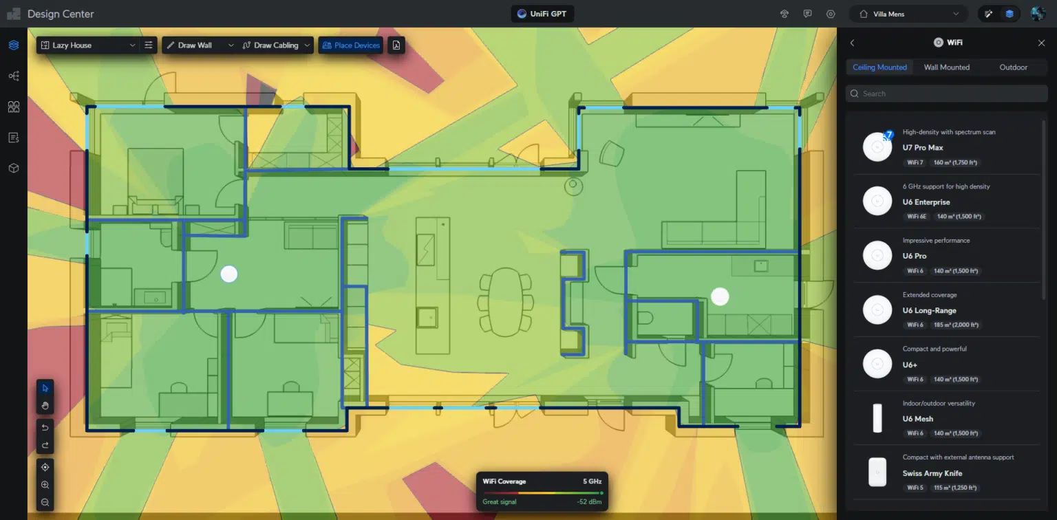 - Использование потолочных и настенных точек доступа— оптимизация распространения сигнала в зависимости от планировки;