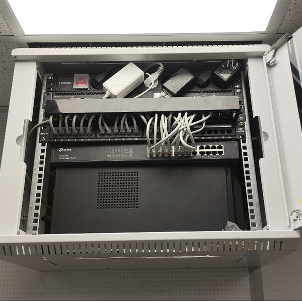- Организовано централизованное сетевое оборудование – все компоненты аккуратно смонтированы в одном телекоммуникационном шкафу, что обеспечивает порядок, простоту обслуживания и защиту техники.