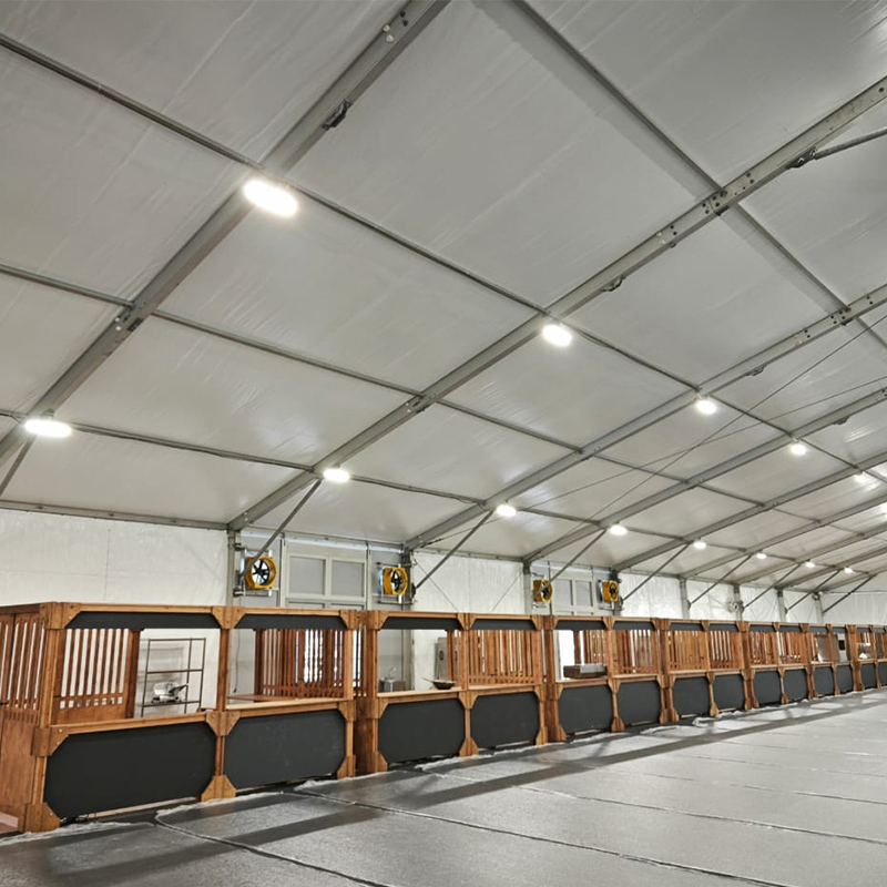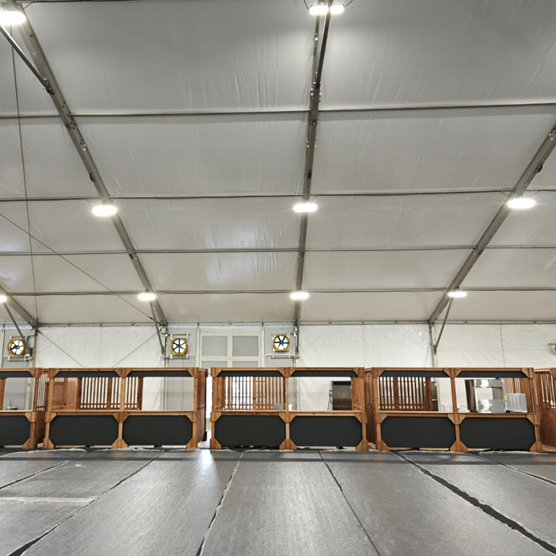 - Монтаж светильников: установлено 62 светодиодных светильника SVT-STR-M-96W, которые обеспечили равномерное освещение всего периметра павильона 25×55 м.