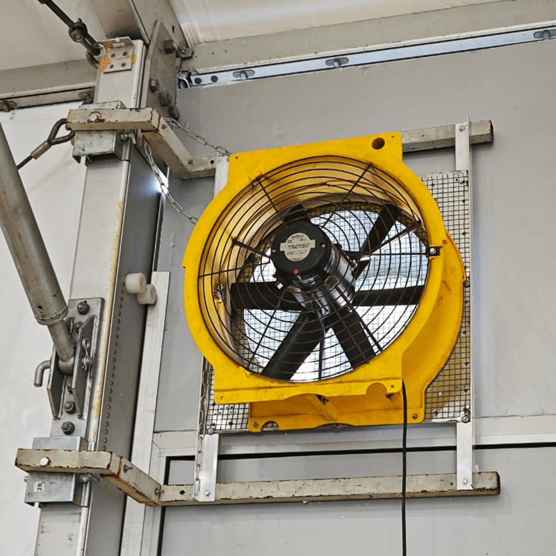 Для временного павильона была организована полноценная вентиляционная система, обеспечивающая комфортные климатические условия внутри конструкции. Специалисты смонтировали 4 вентилятора TTV7000, а также один канальный вентилятор, что позволило создать эффективную циркуляцию воздуха по павильону. Для локальной вытяжки и удаления загрязненного воздуха был установлен вытяжной зонт размером 2000×1240 мм с опорной рамой, а для прокладки потоков использовались 3 метра воздуховодов из оцинкованной стали диаметром 200 мм.