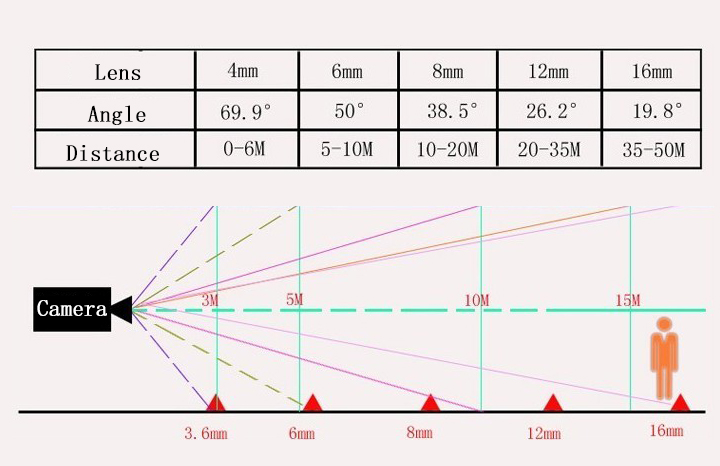 Фокусное расстояние объектива определяет, на каком расстоянии работает камера видеонаблюдения и какой угол обзора она охватывает. Чем больше это значение, тем дальше может видеть камера, но при этом сужается угол обзора.