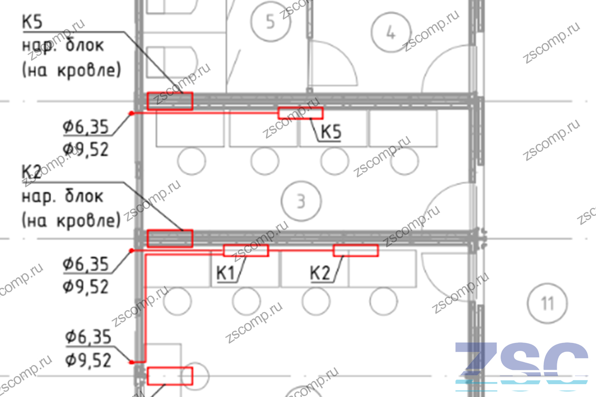 Так, для обеспечения отопления мы предусмотрели более 30 конвекторов и тепловую завесу, а для кондиционирования – 15 сплит-систем суммарной мощностью охлаждения 54 кВт. Пожарную безопасность обеспечивают 17 дымовых и 5 ручных извещателя, а также 17 речевых и 5 световых оповещателя. В проект водоснабжения вошли 80 метров трубопроводов и 3 емкостных водонагревателя суммарной мощностью 50 литров, а в проект водоотведения – 30 метров трубопроводов, а также комплекты сантехники. Электроснабжение офисных помещений обеспечивал единый электрощит, который обеспечивал электроснабжение остальных электрощитов каждого контейнера. Также мы запроектировали более 40 обычных и 23 аварийных светильника, более 20 выключателей, 270 розеток, а также около 2 километров электрокабеля. Все эти проектные решения были переданы на производство, на основании которых и было выполнено изготовление контейнеров.