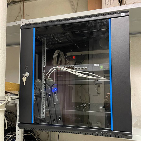 Вся инфраструктура аккуратно собрана в телекоммуникационном шкафу 19" на 12U с полками, блоком розеток и активным оборудованием. Проложено 160 метров витой пары Cat 5e, а также 30 метров кабеля на крыше – с учетом требований к внешней защите и долговечности.
